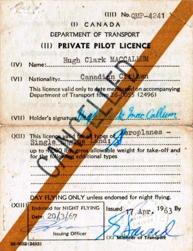 So who wants to be a bush pilot and how do you go about it, what does it take? For Hugh it was a nudge from a female student at the University of New Brunswick who suggested that Hugh might be better at cross country if he got himself airbourne. Indeed, she being a weekend parachutist, she knew the fly boys and it would be a relatively easy introduction. So it was in 1962 after a summer student secondment on a Distant Early Warning Supply Ship operating in the Arctic, that Hugh caught the flying bug watching Bell 47s lift from the deck of the supply ship. In the Autumn of 1962 he bit the bullet and enrolled at Fredericton Aviation for a PPL ( Private Pilot's License). he trained on a Fleet Canuck 80 and like all the aircraft in the fleet they had no radios, it was all done by Control Tower lights, Green for go and Red for stop, literally; but for $450 dollars who was going to be picky? So one hour here, another there, Hugh quicky logged 37.5 hours and soloed in just 6.75 hours ( in those days it was normally 7-10 hours) and this included flight time on a wonderful new Cessna 172 "CF-NBH" November Bravo Hotel. On April 17th 1963, the Spring before Kennedy's assassination, Hugh got his wings and was issued PPL #QMP4241.