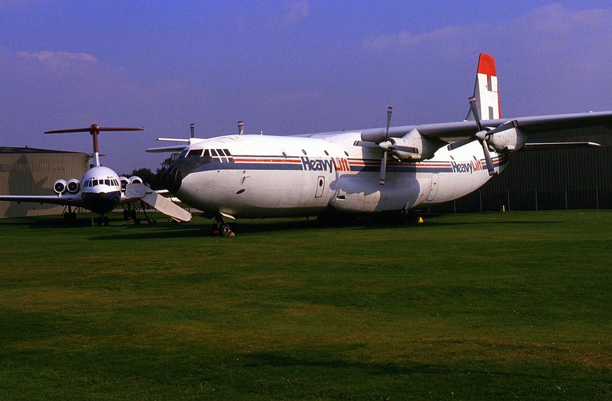 (L to R) 1) Vickers-Armstrong VC-10 (4 jet engines on tail) BOAC used it for passengers 29 June 1962 thru’ 29 April 1964; then the RAF used it as an aerial fuel tanker from May 1964 thru’ 20 September 2013 because the high tail elevator controls & the engines mounted on rear fuselage made it easy to operate to/from high altitude airports with desert sandy conditions at RAF Museum Cosford Shropshire,England ; 2 )Shorts Bros plc Belfast HEAVY LIFT cargo a/c at RAF Museum Cosford, Shropshire,England 1 October 1987
