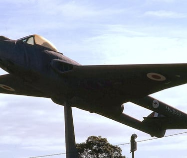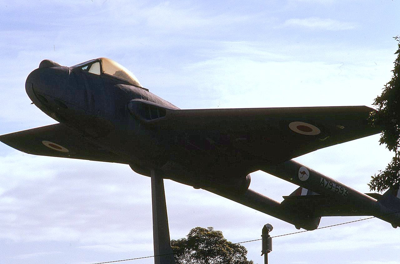 A79-593 deHavilland Vampire on pylon in Wingham,NSW 31°52'S. 152° 22' E. (free Wikipedia). Australian kangaroo logo visible on starboard tail boom some Vampires were built in Australia for the RAAF/Royal Australian Air Force*. 25 February 1981