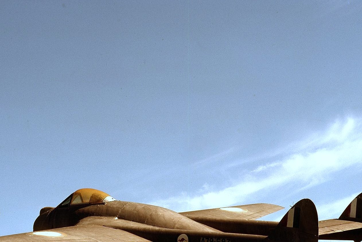 CF-YULA79-593 deHavilland Vampire (top view- vintage 1949-1953) in Wingham,NSW on pylon beside Return from Service League bldg. 09:00AM - 25 February 1981 Beechcraft "Mentor" aerobatic a/c owned by Ken McTavish