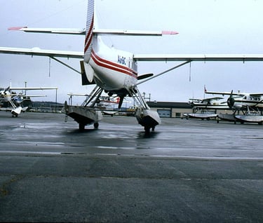 C-FCLU Cessna 185 blue , C-FUJM DHC-3 Otter (open passenger door), C-FJFQ DHC-2 Beaver , C-FQRI DHC-3 Otter, C-FOCQ DHC-2 Beaver - all AirBC