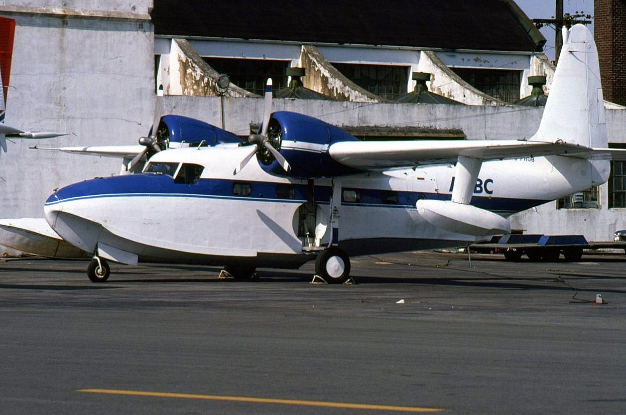 C-FHUB AirBC Grumman Mallard clean & shiny. in front of hangar at CYVR South a/p Whitsunday A/L in Australia bought 4 +? of the WCAL Grumman Mallards for its operation from Queensland to the Great Barrier Reef. 27 May 1981