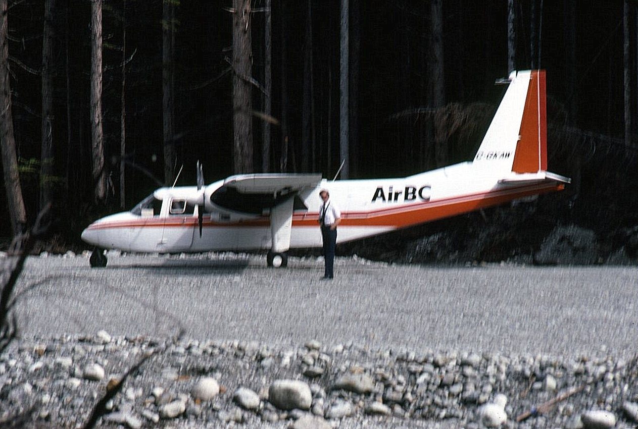 C-FKAW BN2A/Britten Norman Islander AirBC on Kimsquit airstrip. Pilot beside a/c is Uwe Ihssen. 22 June 1981