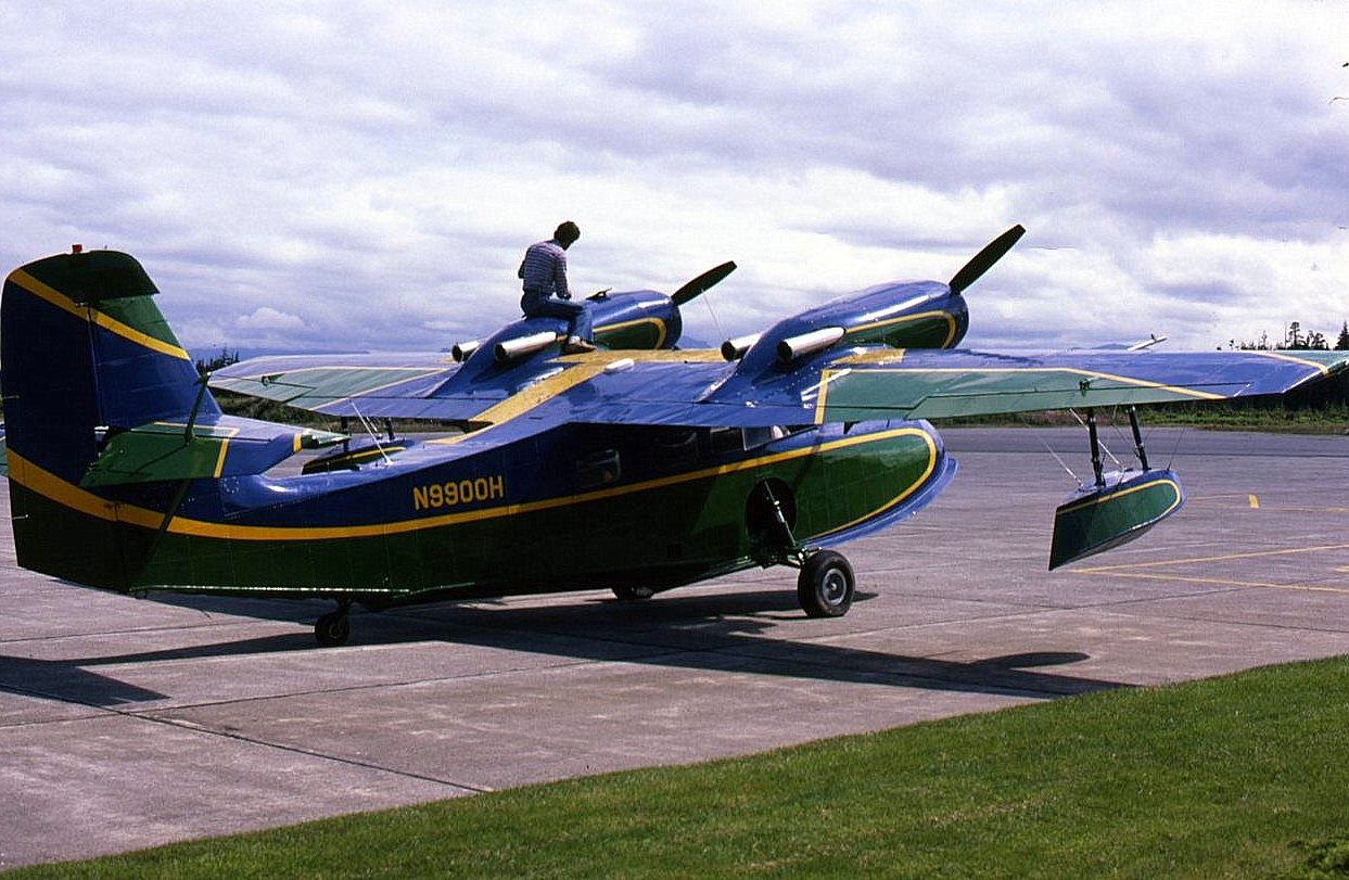 N9900H Grumman Widgeon (starboard side) its American owner sitting astride port side engine checking the engine's oil level at CYZT a/p. 25 June 1981