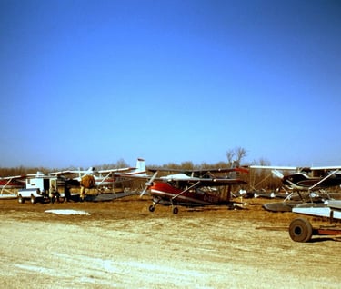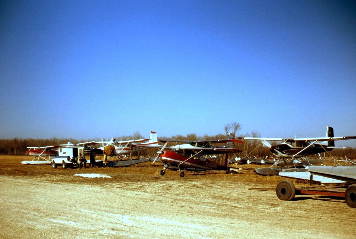 Cessna 185 (on wheels-red livery with white stripe) owned by Ben Siemens & Diane Chudley at Selkirk's airstrip located 20 nautical miles north of CYWG