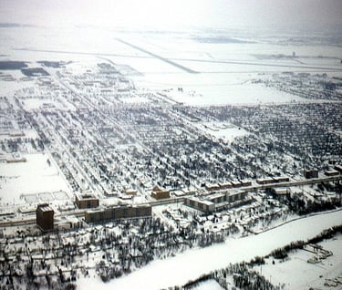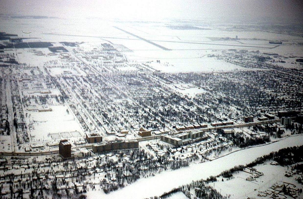 Over Assiniboine River flying east on base leg for CYWG Rwy 36. Portage Avenue identified by brown coloured apartment bldgs