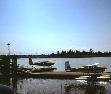 (left to right) Helio Courier - Cougar Air of CYYJ/Victoria. C-FMOJ Cessna 180. And far right CF-Y?N ( Piper Aircraft rudder?
