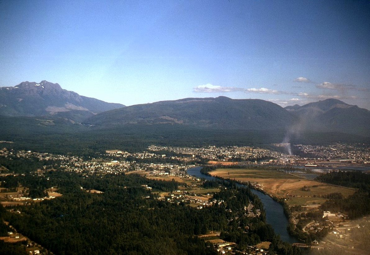 This photo is of the town of Port Alberni on a clear early May 1978 day.In winter the town is shrouded in rain or fog & smoke from the various mills. That may have changed due world's economic downturn? ( the bare brown spots or slashes in otherwise forested areas are where trees have been cut/logged )