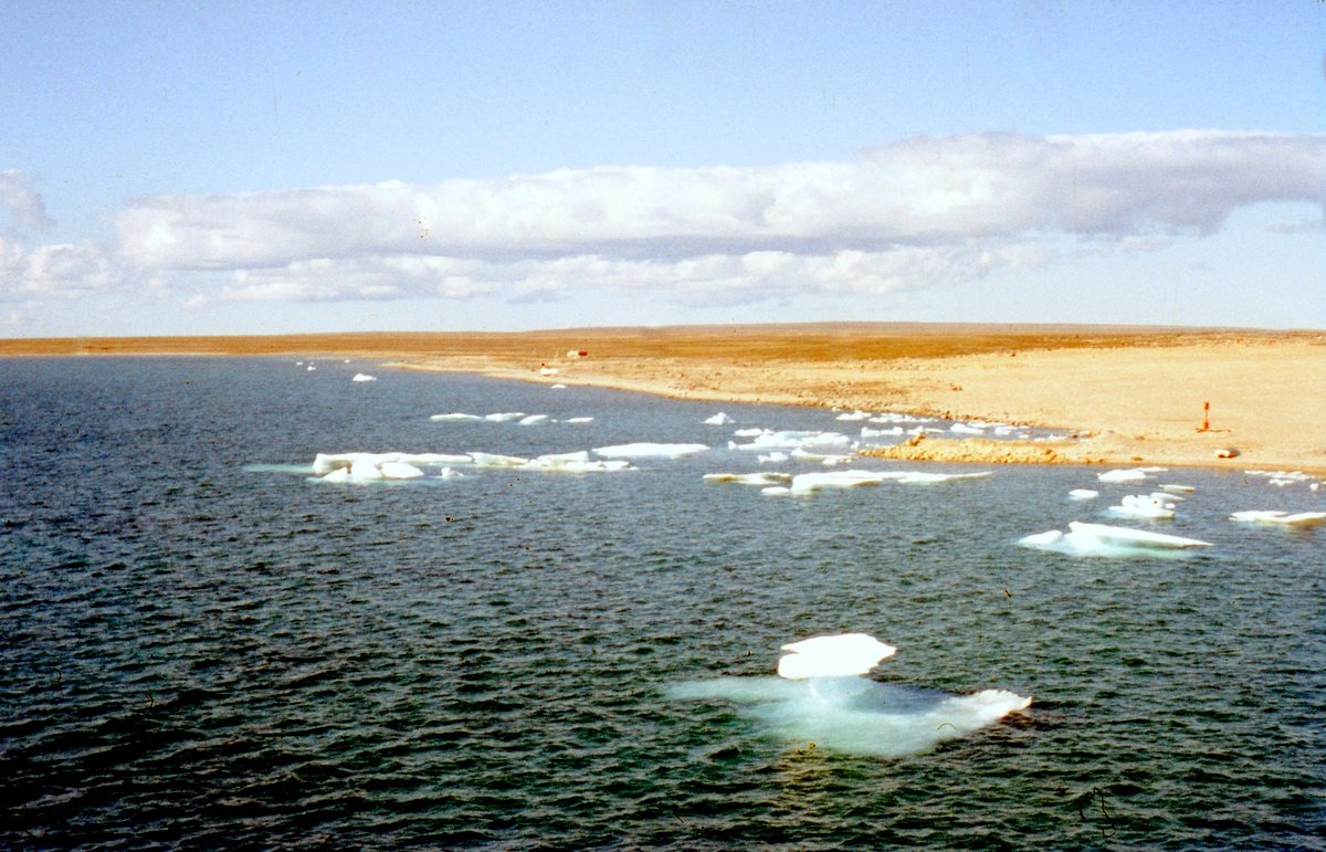 August 1962 - grounded pieces of the winter’s pack ice at at Cam 1 (Jenny Lind Island) 68°39′25″N 101°44′19″W - water depth and feet.epth 8 feet