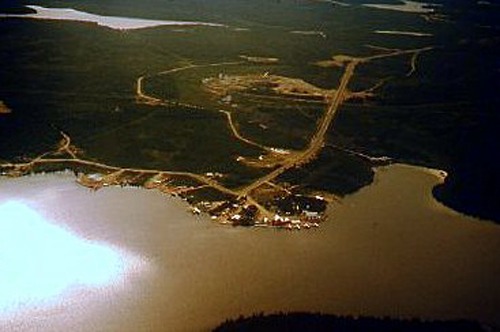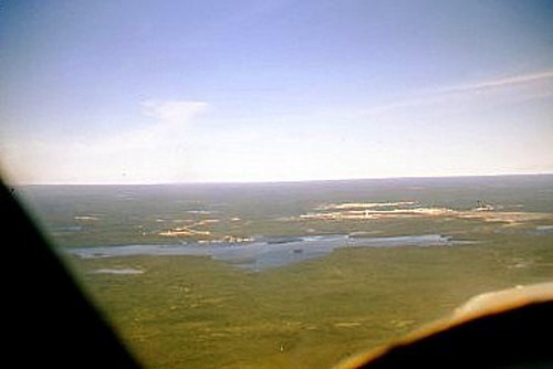 View is west from 5 miles east of Eldon Lake,MB from CALM Air's (FBA-2C) CF-SOP at 2,000' . Foreground is Eldon Lake with 6 floatplane air operations docks on its' centre westshore . From L to R : La Ronge Aviation Svcs, Manitoba Gov't Air, Parson's Airways, Sherritt Gordon Mines Ltd, Chiupka Fish Company, Calm Air Ltd. *** if my memory is faulty , please advise correct order