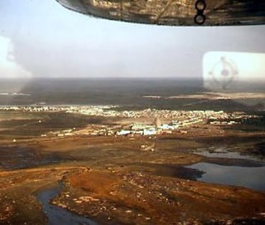 I was flying CALM Air’s FBA-2C CF-SOP SSW by Lynn Lake on approach to land at Eldon lake,MB (only ventillation into cockpit was a small round rotatable pc in each window , unlike Cessna aircraft whose windows were hinged) . I had spent many hours polishing the unpainted aluminum, thus the wing underside reflection which I only noticed now in August 2016 - 46 years later ! Lower third of photo are former & then current tailings ponds & dikes. Above & far right 3 bldgs of CNRail’s Lynn Lake terminal/end of the line! Left & centre the large white structures are Sherritt Gordon Mines' A mine site , including headframe, crushing bldgs , various conveyors, short street with rectangular bldgs connecting mine to town are single men & women bunkhouses. Residential houses/apartment bldgs occupy area above greyish arae. To the left, the bigger bldgs was commercial area (ie) movie theatre , recreation centre, curling club, Central Grocery & Meats , a bank , post office, hotel etc. To far left was the town’s new residential subdivision. What looks like water & sand at centre far left was the tailings pond of Sherritts’ other active underground Farley mine adjacent to an open pit . Centre right beyond apartment blocks is CYYL/lynn Lake airport bldgs & paved runways. (Summer 1970)