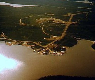 Overhead view from west to east of Lynn Lake,MB Sherritt Gordon's 2 primary mine sites from CALM Air (Found Bros Aircraft/FBA-2C) CF-SOP . Dark foreground = West Lynn Lake ; bottom right is road to Eldon Lake float planes' base ,far upper right is the then new gravel road north then south-east 185 miles/322km to Thompson,MB . In between is crescent shaped Lynn Lake townsite. Centre right is the Farley mine site showing tailings ponds , the unused open pit , the mine headframe . Mid centre left is Sherritt's A Mine with head frame and operating bldgs. Upper right third are the then current tailings ponds. I think the cleaner water eventualy drained in to Eldon Lake? (Summer 1970)