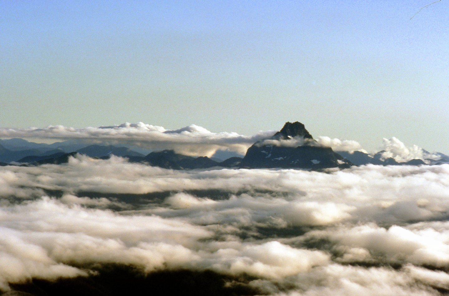 Golden Hinde 1 September 1982 - view westerly from C-GIRL (Cpt Len Bryan was PIC/pilot-in-command) ***our altitude 7400ft (round instrument middle row at far left)***  https://en.wikipedia.org/wiki/Golden_Hinde_(mountain) https://www.summitpost.org/the-golden-hinde/images/p-335359