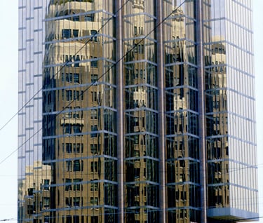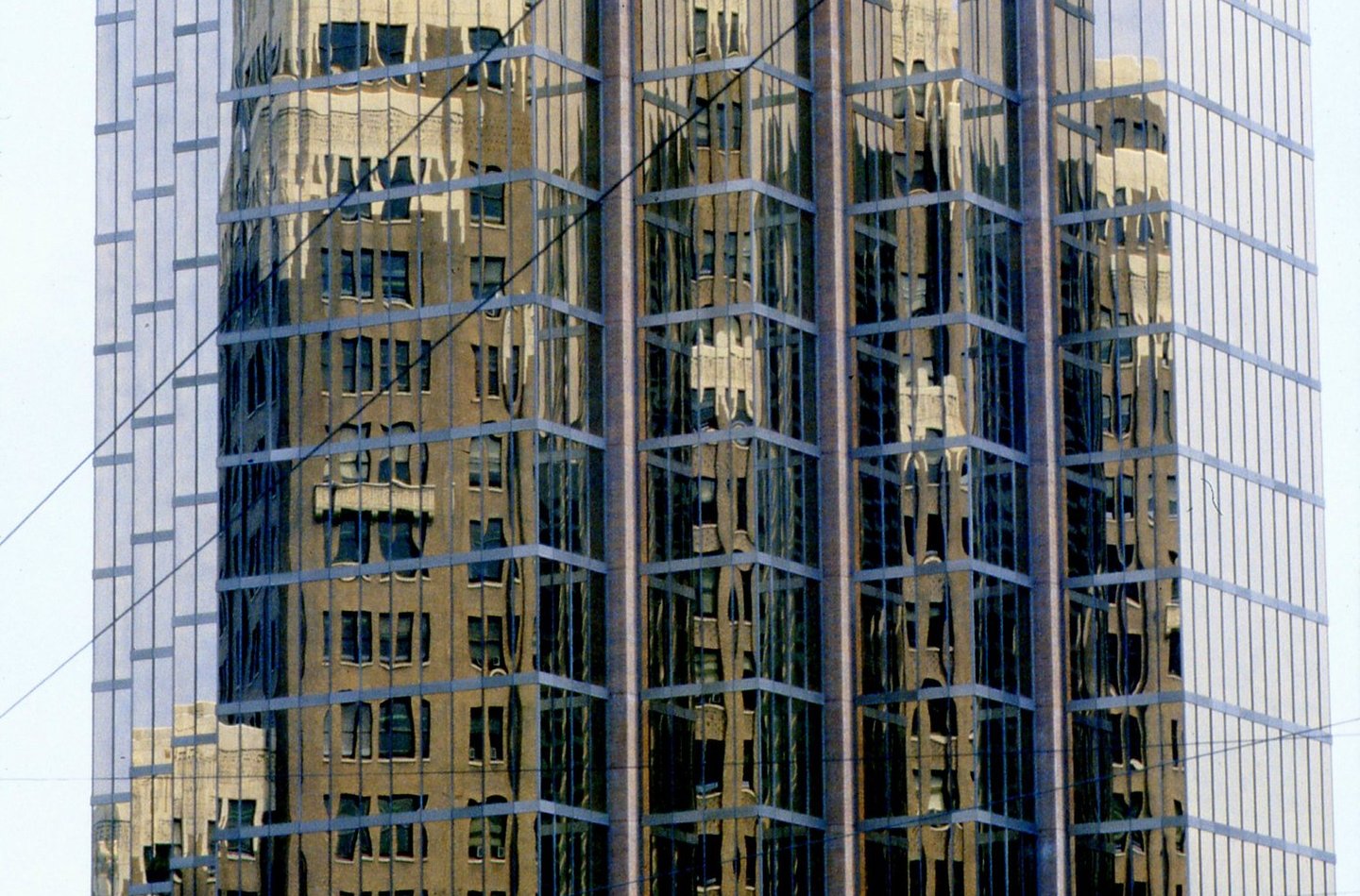 Building reflection 22 April 1983 - Custom’s Building reflected from across the corner of Burrard and Hastings streets,Vancouver. BC https://en.wikipedia.org/wiki/Marine_Building https://en.wikipedia.org/wiki/Burrard_Street https://en.wikipedia.org/wiki/Hastings_Street_(Vancouver)