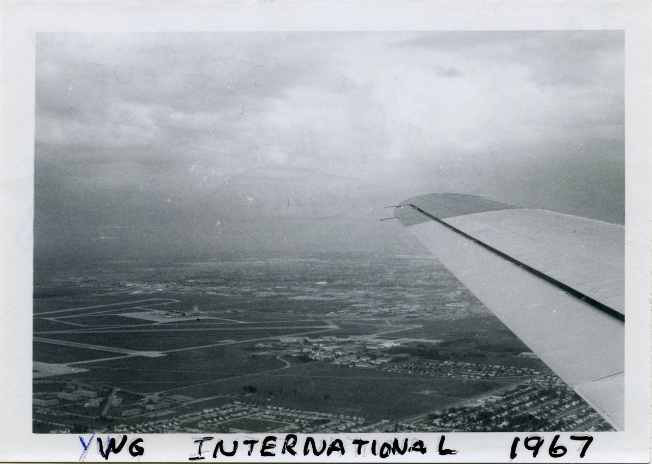 over St James (Winnipeg),MB view south-west to north-east .RCAF hangars, etc in foreground under wing. CYWG Control tower & pax terminal near centre left. July 1967