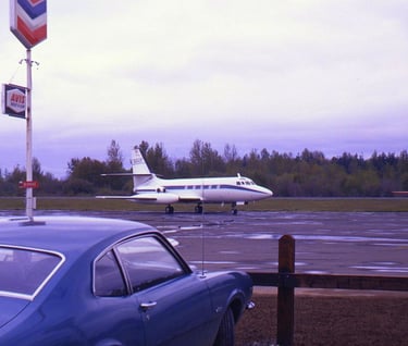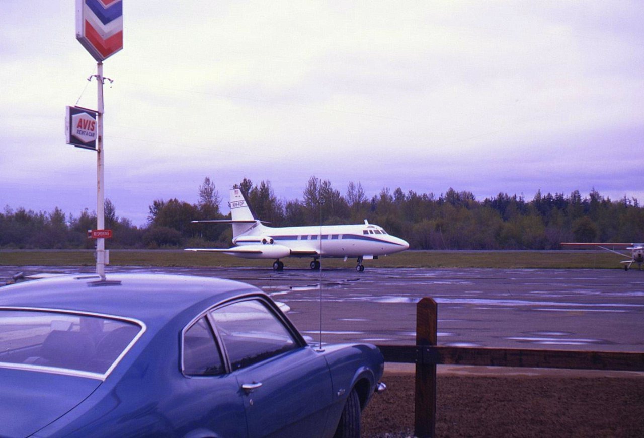 N94CP JetStar at BLI/Bellingham,Wa,USA a/p. (his car in foreground). April 1970 .