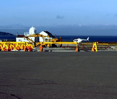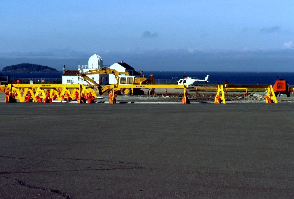 C????? Hughes 500 helicopter its'’ blades tied fore & aft . Brian Mycroft (VIH) email to Hugh 8 March 2017 believes that was a corporate craft for 'Pat Carson Bulldozing', a YVR Island logging contractor based at Cobble Hill, & which he flew a few times on loan from VIH while the regular pilot on holidays. In background is dissipating fog over Queen Charlotte Sd & mainland BC. 12 September 1982