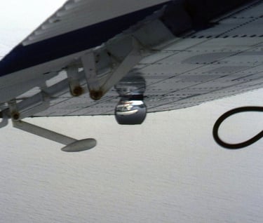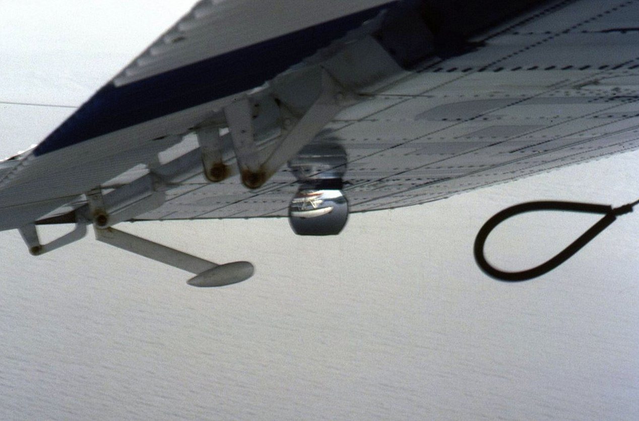 C-FJFQ 'AirBC' Port wing undercarriage indicator mirror. 22 September 1982