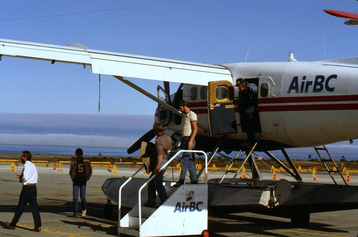 C-FUJM 'AirBC' (in white shirt is Cptn John Patterson). Pax disembarking from this scheduled service flight that came ,perhaps from Rivers Inlet at CYZT a/p. 15:30 on 11 October 1982