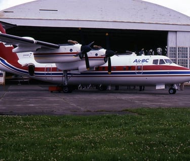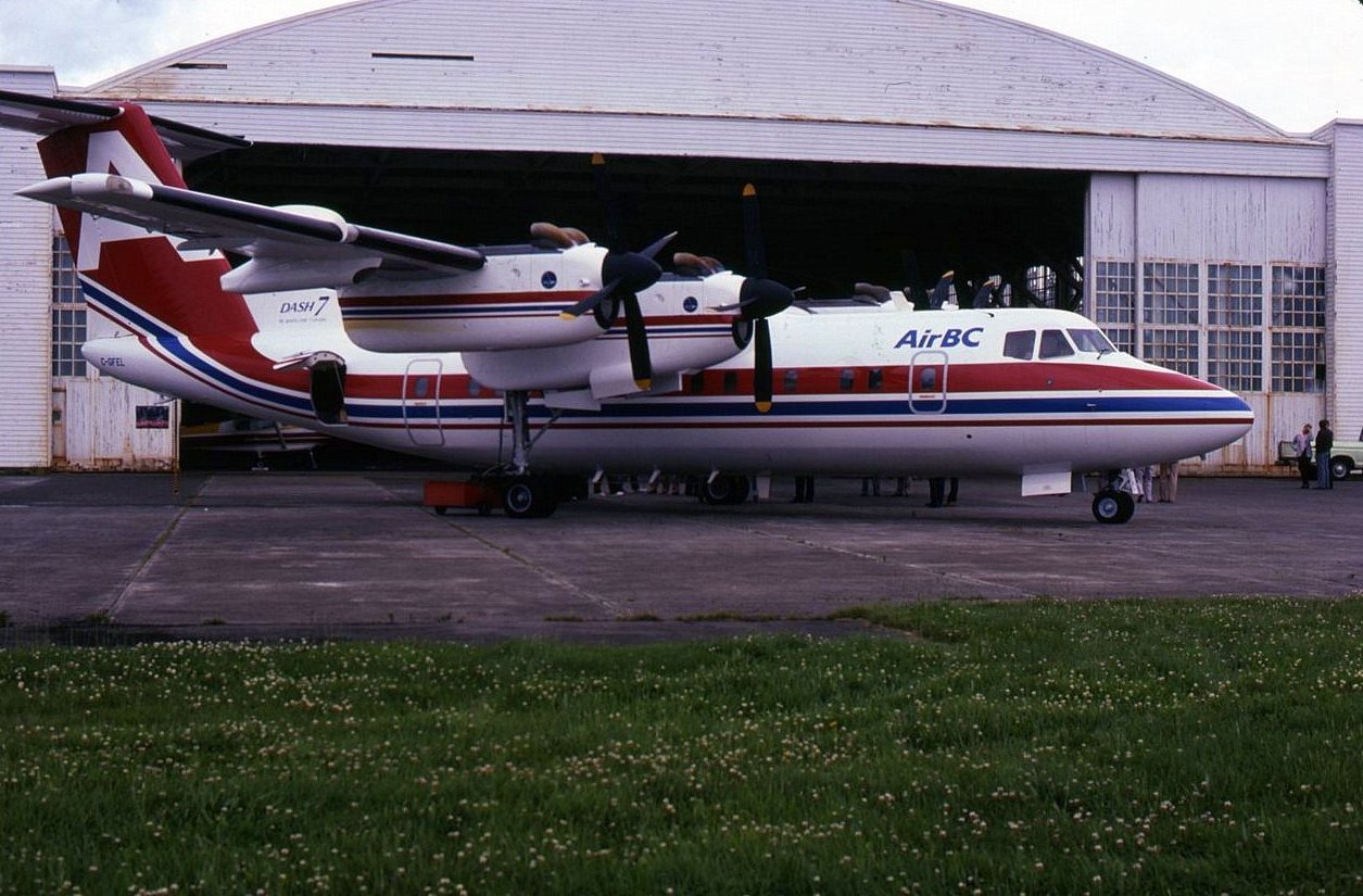 C-GFEL AirBC’s first Dash 7. Inaugural flight from CYVR/Vancouver to CYZT/Port Hardy,BC. 26 July 1983