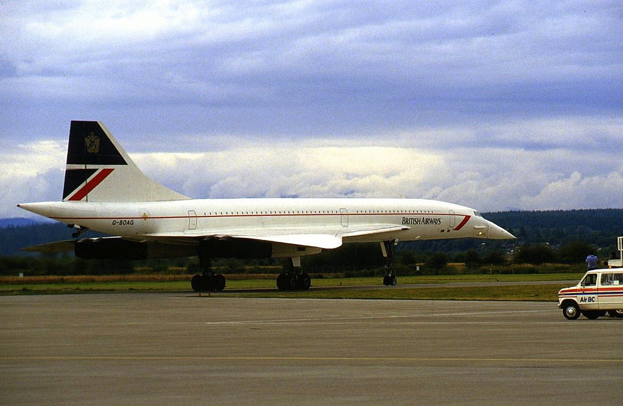 4 of 7. G-BOAG Concorde British Airways at CYVR taxiing to CP Air hangar (view is north-west). 11 July 1986
