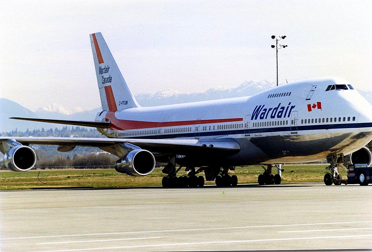 C-FFUN Wardair Canada' nose whl #398, at CYVR a/p N-5 apron. Mule/tractor ready for pull to Boarding Gate. 10:00AM April 2, 1987