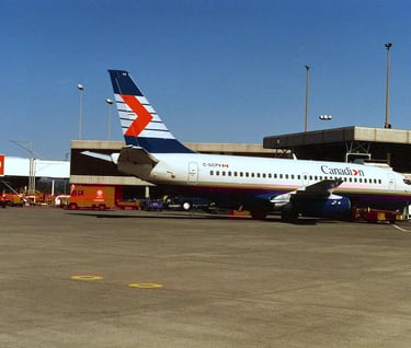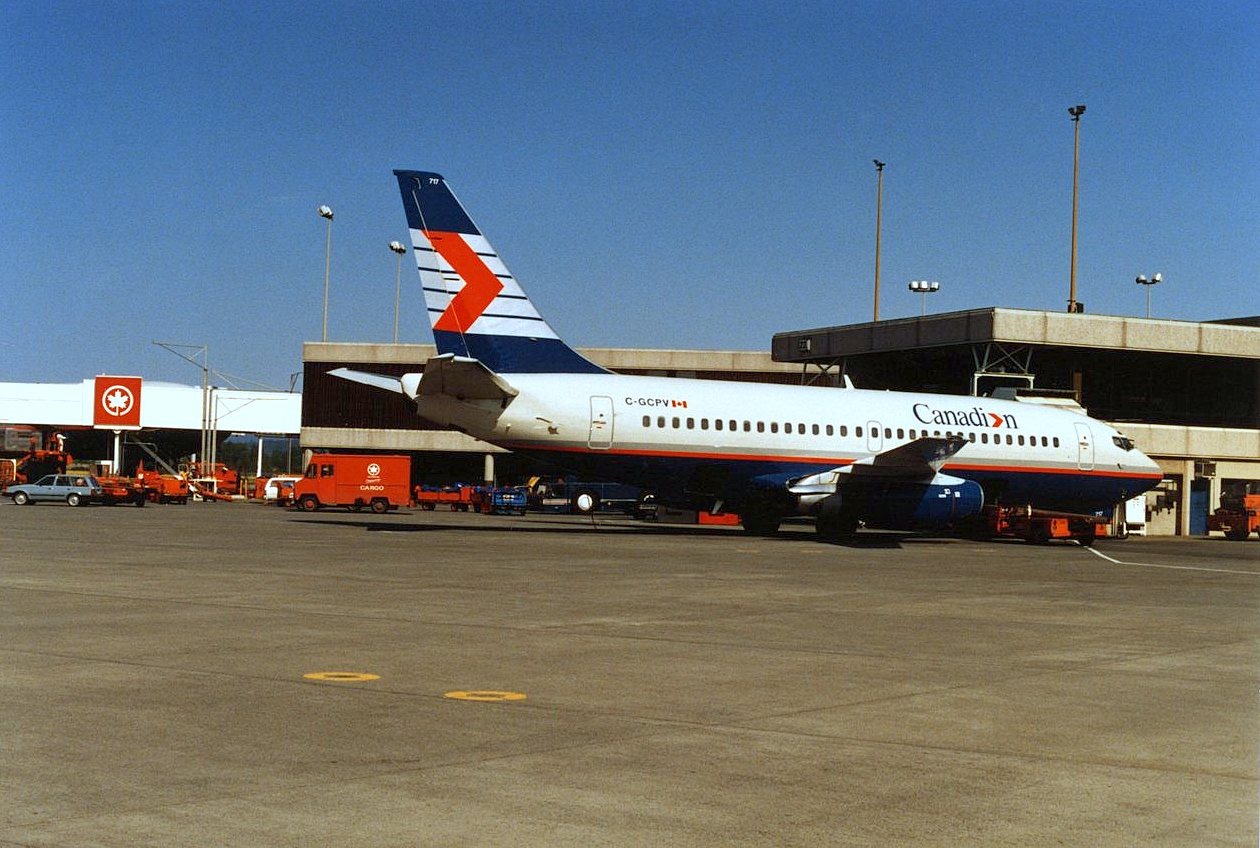 C-GCPV Boeing 737 (fin 717) Canadi>n (newest livery of amalgamated CP Air & Pacific Western A/L) at CYVR’s domestic Gate 23. 10:55PST April 22,1987
