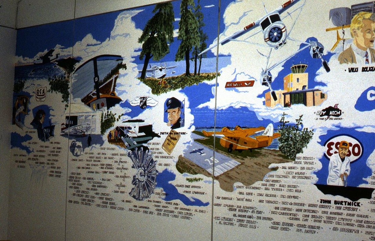 1st in set of 4 pictures that AirBC YZT's pilot Jack Schofield drew & painted using acrylic colours on 4 panels of 4' X 8' hardboard (metalic hardness) over a period of six months in 1980-1981 in the CYZT AirBC pilots lounge.