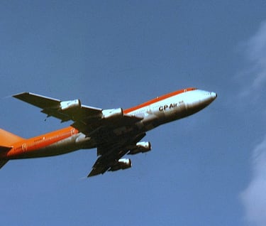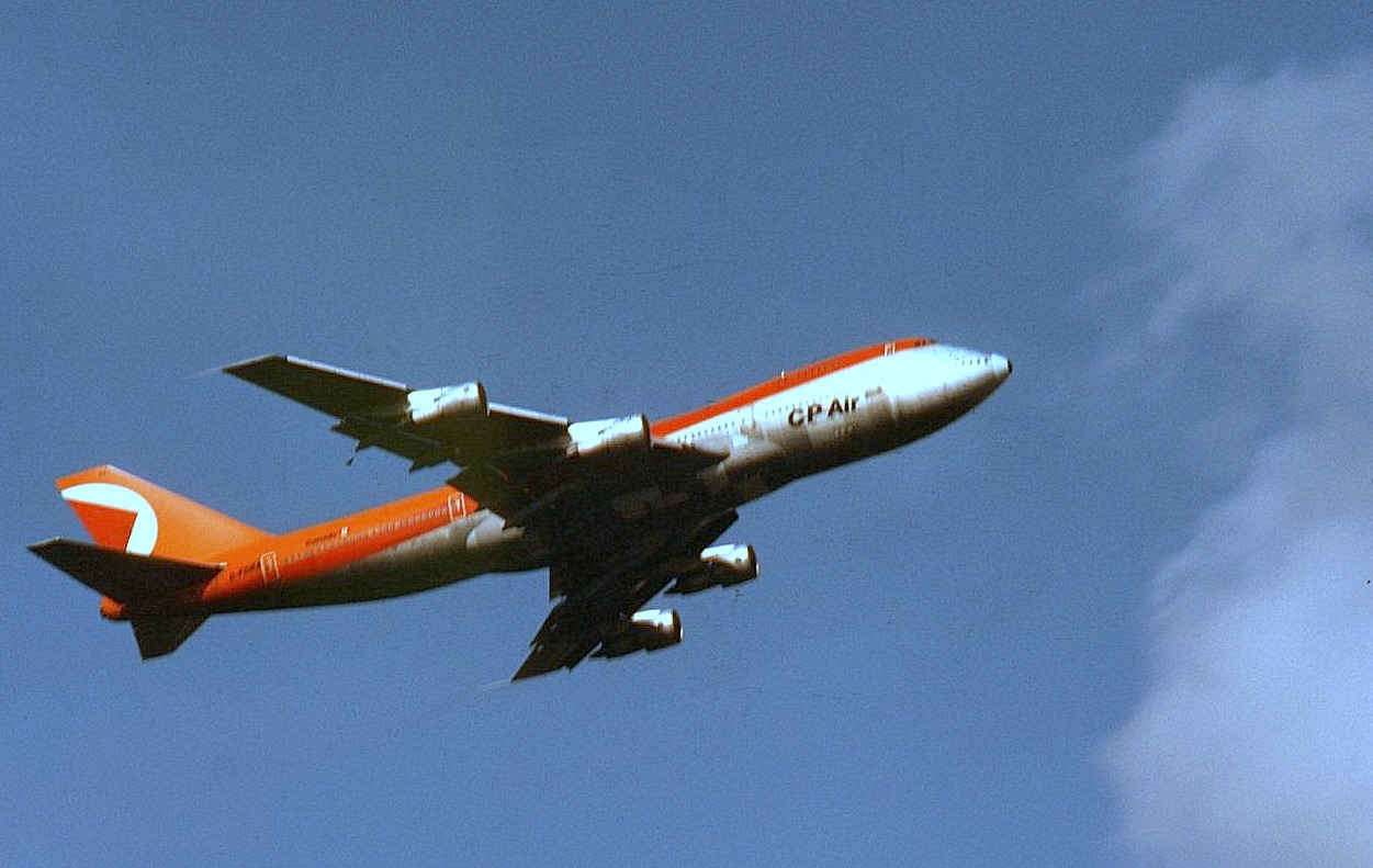 C-FCRA Boeing 747 CPAir airborne from CYVR's Rwy 08 (film : 210mm, f 22 , 50th). 29 September 1981