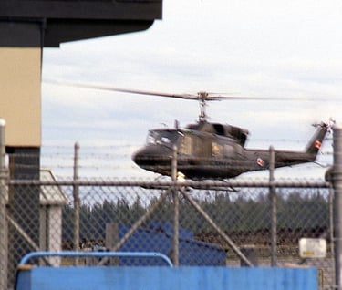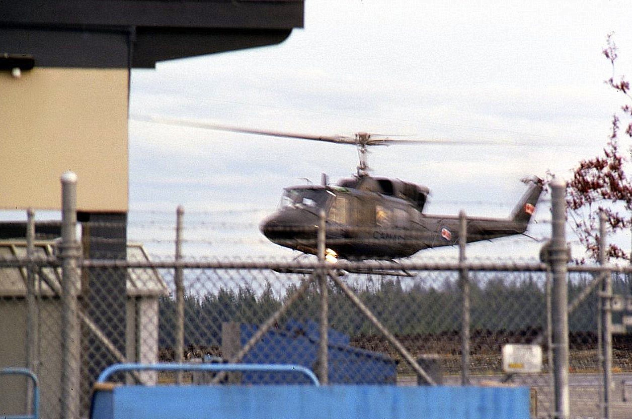 Canada Armed Forces(CAF) CH-135 Twin Huey landing at CYZT (film : 55mm, f 8, 15th). 2 November 1981