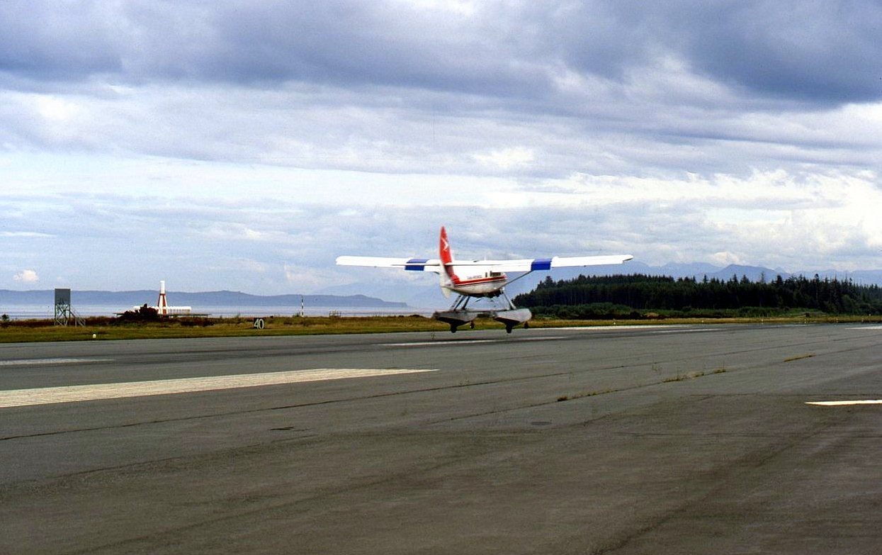 #14 of 16. C-FRHW DHC-3 Otter with main wheels ON and nose wheels will touch as he loses lift.When he came to a STOP , he turned around to taxi back to the hangar area.
