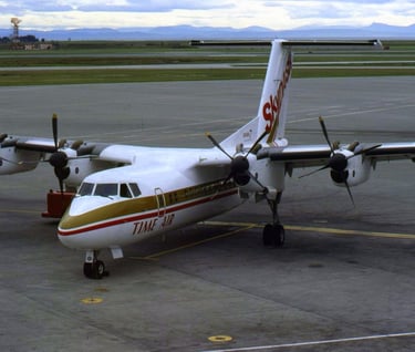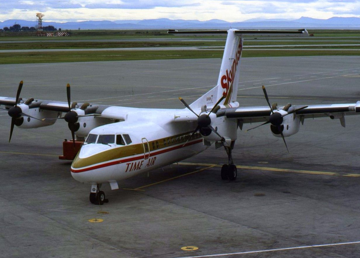 C-GTAD Dash 7 DHC-7 Time Air (view of its' port side) on tarmac at CYVR/Vancouver Int'l passenger terminal. In distance is south Vancouver Island. 6 September 1982