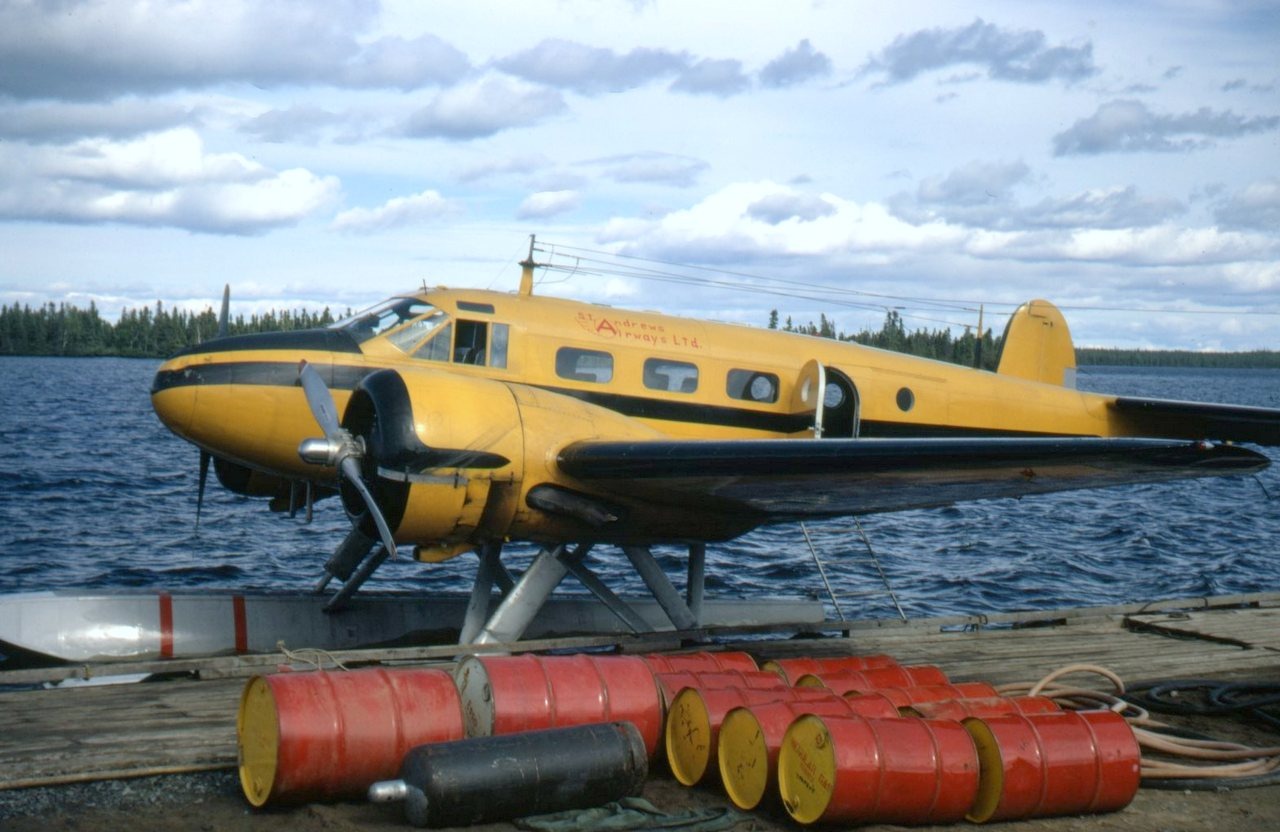 CF- ??? Beech 18 St.Andrews Airways tied up to CALM Air’s Eldon Lake dock July 30,1971 *** June 1977 , I flew for St.Andrews A/W at Garden Hill (Island Lake)MB ***