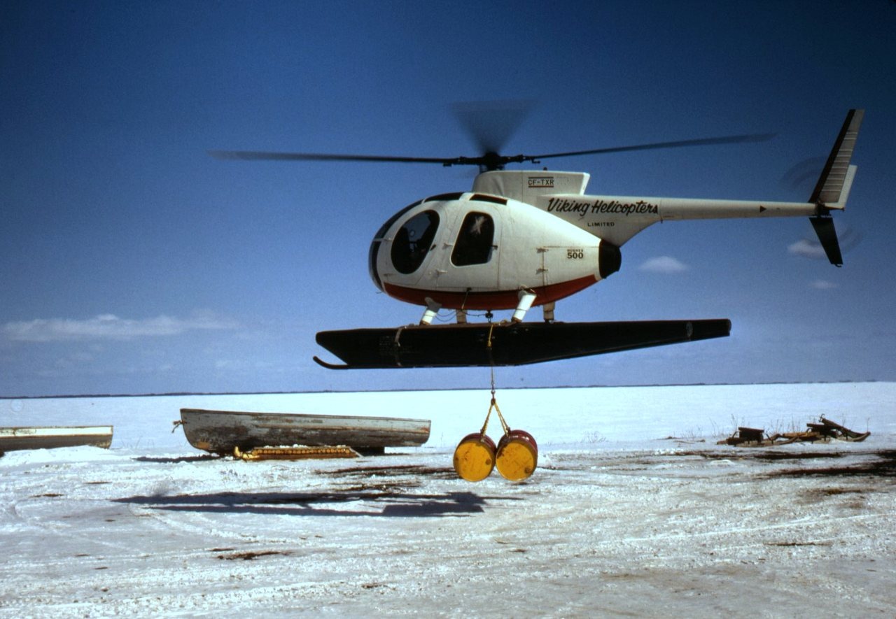 CF-TXR Hughes 500 helicopter has just lifted 2 X 45 gallons fuel