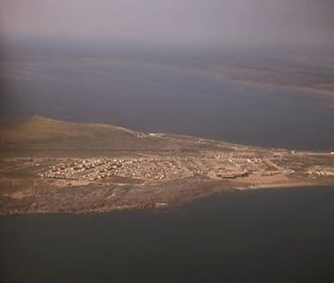 Town of Churchill,MB . Viewing southwest , foreground is Hudson Bay with Churchill River beyond. Large multi shaped bldg centre right is the community centre - completely enclosed to keep heat inside and roaming 1,000 lb + polar bears their cubs outside. Nelson River flows north easterly in this part of north-eastern Manitoba. (13 September 1976)