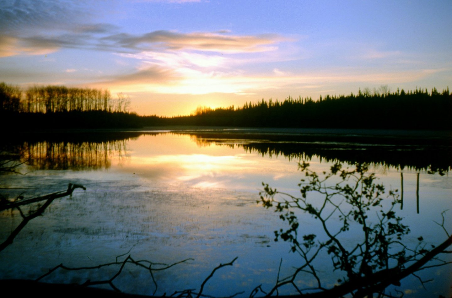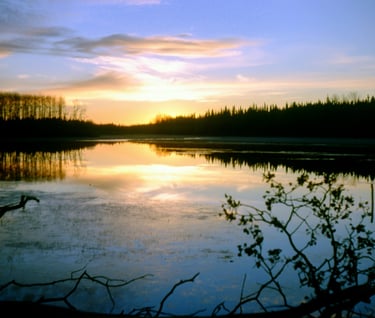Gerry & Marty McKay’s hunting camp 15 October 1977. Sunrise and skim of ice in a bay at south-east corner of Sachigo Lake, Ontario https://en.wikipedia.org/wiki/Sachigo_Lake_First_Nation Pilots carried good sleeping bags during winter (mine was a 5 star eider down filled bag made by Woods Canvas, Winnipeg, MB http://www.woods.ca/content/microsites/woods/en/gear-apparel.html